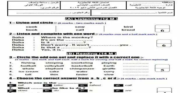 امتحان لغة انجليزية للصف الخامس الابتدائى الترم الثانى 2019
