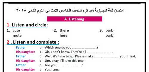 امتحان ميدتيرم Mid Term للغة الانجليزية للخامس الابتدائى ترم ثانى منهج 2018