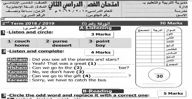 امتحان لغة انجليزية للصف الخامس الابتدائى ترم ثانى 2019 بتوزيع الدرجات