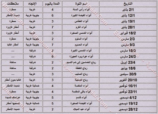 السبورة عاجل جدول بمواعيد النوات الشتوية واسمائها طوال العام