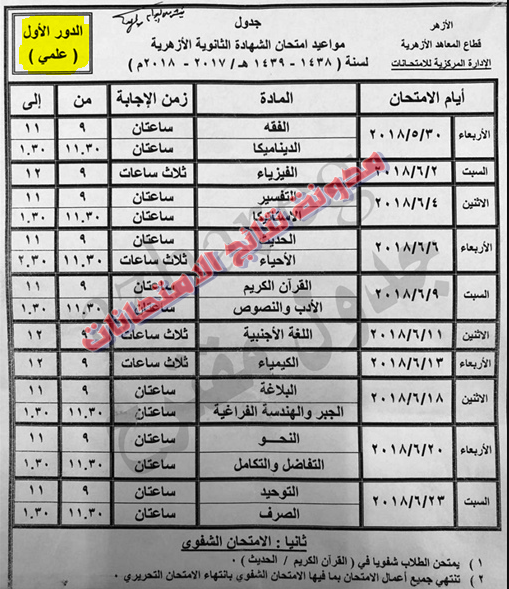 يذكر أن بوابة الأزهر قد نشرت نماذج تجريبية لجداول امتحانات الشهادة الثانوية الأزهرية بقسميها وفتحت باب التعليق عليها لكل القائمين على العملية. نشر قطاع المعاهد الأزهرية على موقع البوابة الالكترونية للأزهر الشريف على شبكة الانترنت جدول مواعيد امتحانات الشهادة الثانوية الأزهرية للعام الدراسى الحالى 1438 1439 هجرية الموافق 2017 2018 ميلادية الدور الأول للشعبتين. يبدأ الأزهر الشريف الأ سبوع المقبل تحرير استمارات امتحانات الشهادة الثانوية للعام الدراسي 2020 2019. موعد امتحانات اخر العام 2020 الشهادة الثانوية الازهرية.