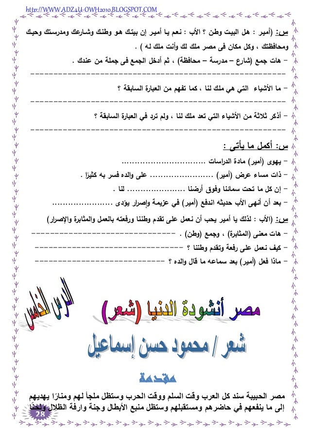 مصر أنشودة الدنيا شعر القراءة و النصوص لغة عربية الصف الخامس الإبتدائي الفصل الدراسي الأول