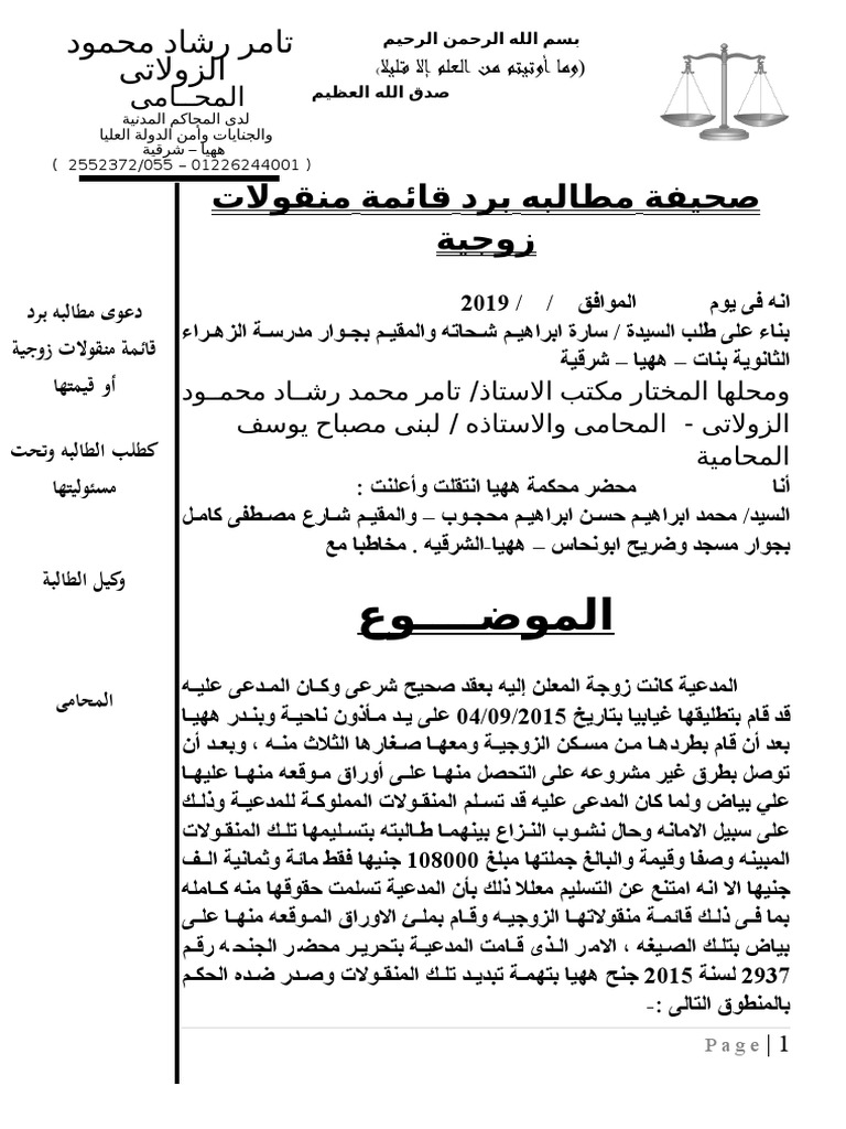 صحيفة مطالبه بقائمة منقولات زوجية
