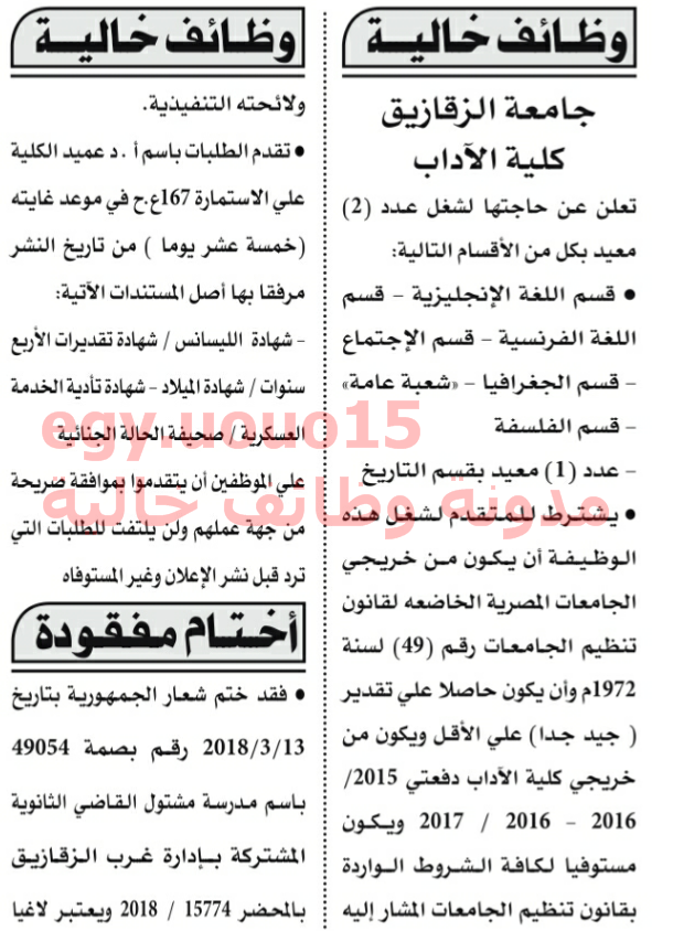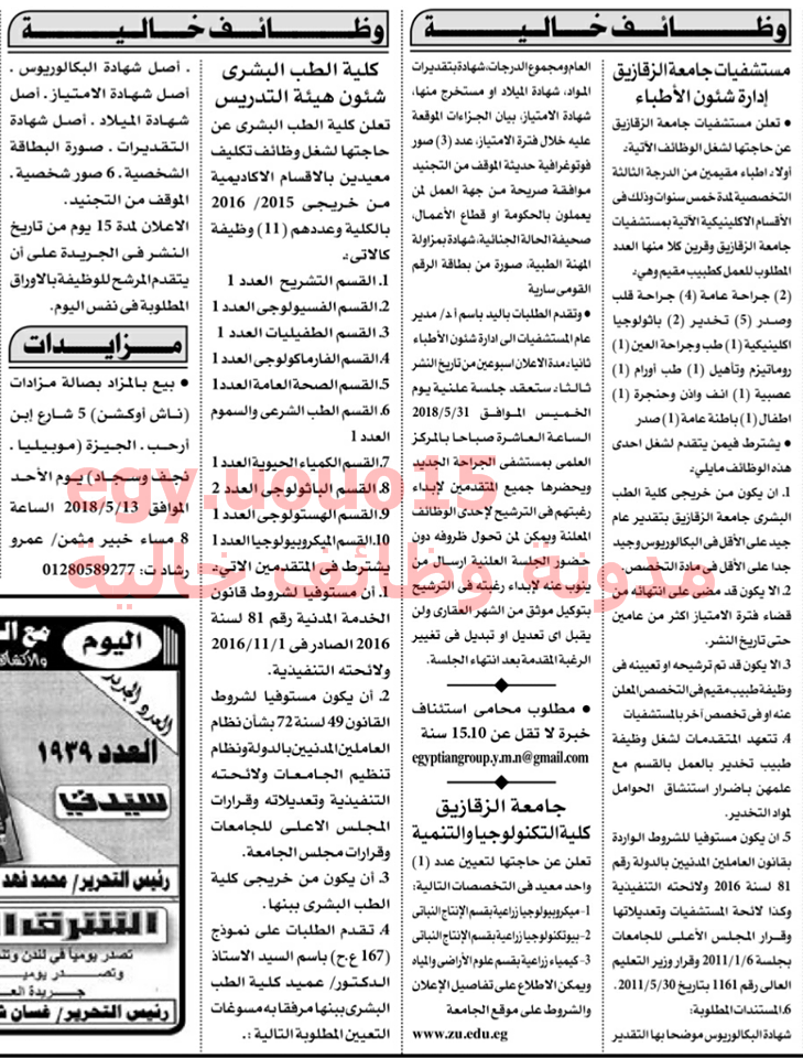 وظائف خالية فى جامعة الزقازيق مايو 2018 وظائف خاليه